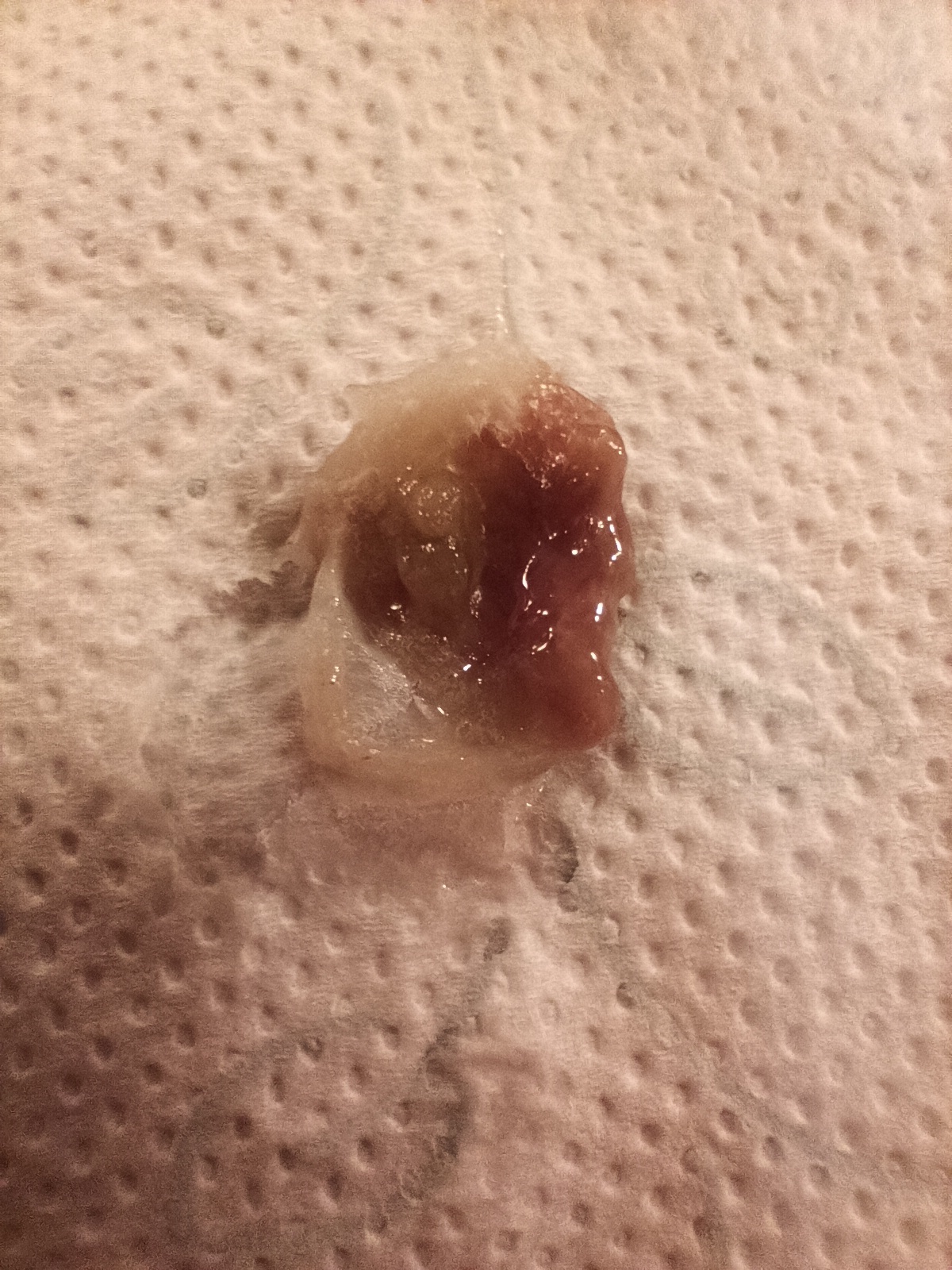 Zaschnięte skrzepy wydzieliny w nosogardle.